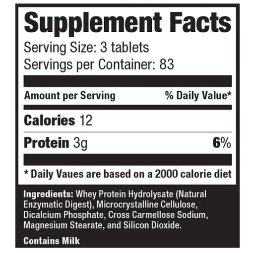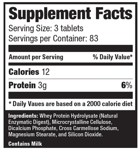 Ингредиенты: гидролизат сывороточного протеина (натуральный энзиматический гидролизат), микрокристаллическая целлюлоза, стеарат магния.