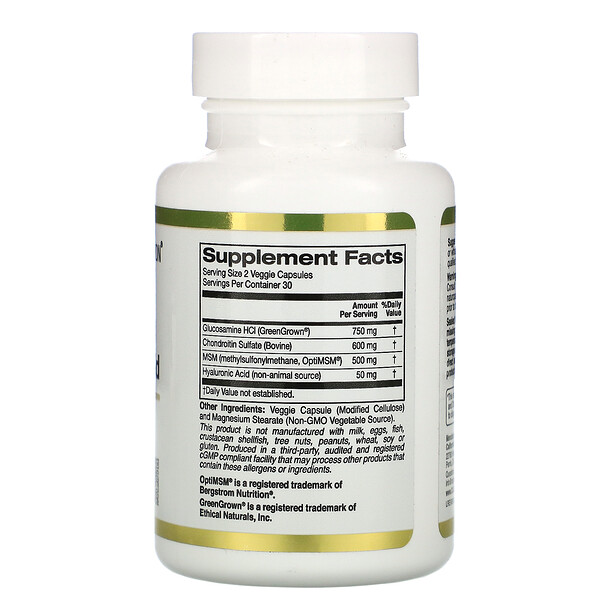 Гарантия 100% Gold Guarantee Глюкозамин, хондроитин и МСМ с гиалуроновой кислотой от California Gold Nutrition® содержит запатентованный глюкозамин GreenGrown® и метилсульфонилметан OptiMSM®, а также хондроитин, полученный от крупного рогатого скота, и гиалуроновую кислоту неживотного происхождения.