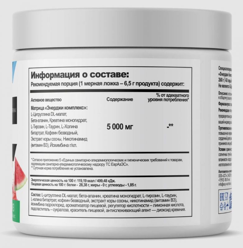 Состав: Л-цитруллина DL-малат, бета-аланин, креатина моногидрат, L-тирозин, L-таурин, L-холина битартрат, кофеин безводный, экстракт коры сосны, никотинамид (витамин B3), йохимбина гидрохлорид.
