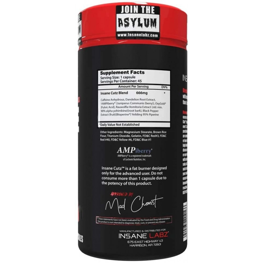 Комплекс Insane Cutz – качественный препарат термогенного действия от компании Insane Labz, способствующий сжиганию жировых отложений и восполнению запасов энергии, необходимой для результативных тренировок. В его основе компоненты растительного происхождения, комплексное воздействие которых быстро и эффективно сжигает жир и наполняет организм энергией без вреда здоровью. Сочетание Insane Cutz с грамотно подобранной программой тренировок позволит получить фигуру мечты в короткие сроки. При производстве Insane Cutz используются исключительно качественные компоненты и современное оборудование, что обеспечивает высокую работоспособность жиросжигателя.