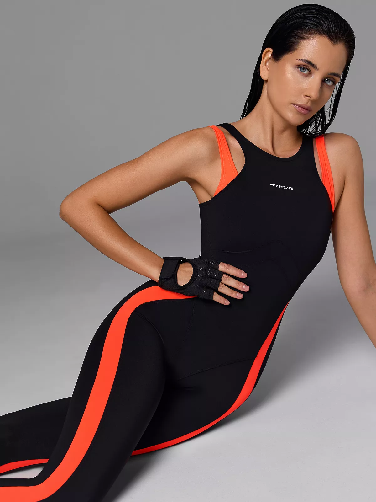 Женский комбинезон для фитнеса – наша адаптация культового тренда «бодикор». Он спортивный и женственный одновременно: двойная бретель и стройнящие лампасы в сочетании с аккуратными подрезами под грудью и моделирующими линиями на спине и талии, перетекающими в модное узкое бикини.