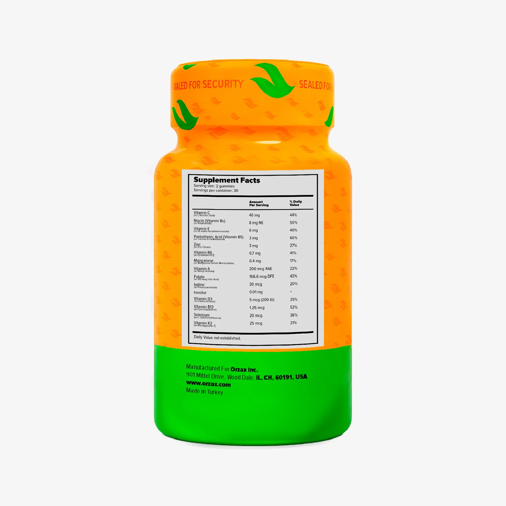 ORZAX Kids Multi Gummies – это вкусный и удобный способ для поддержки организма. Содержат 10 витаминов, 4 минерала и инозитол, необходимые для нормального роста и развития детей, среди них – витамины А, D, Е, С, К, группы В, цинк, селен, йод, марганец. Мармеладки имеют приятный апельсиновый вкус, что делает профилактику дефицитных состояний простой и удобной.
