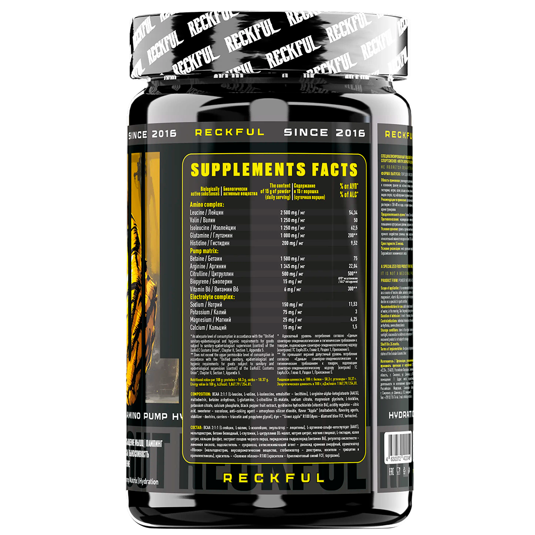 Зарядите свои мышцы энергией, восстановлением и мощным пампингом с Reckful® Intra Workout – уникальной формулой BCAA + Hydration + Pump для максимальной производительности.
