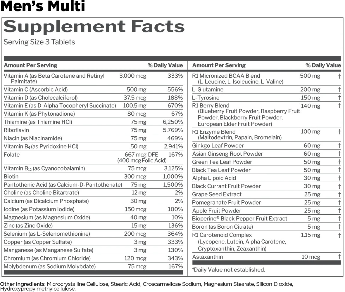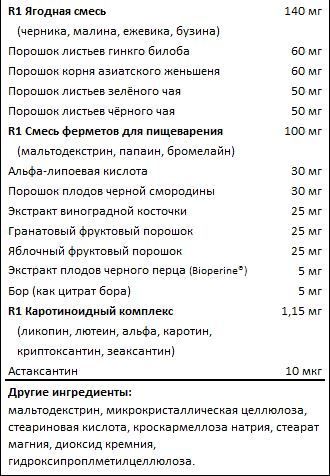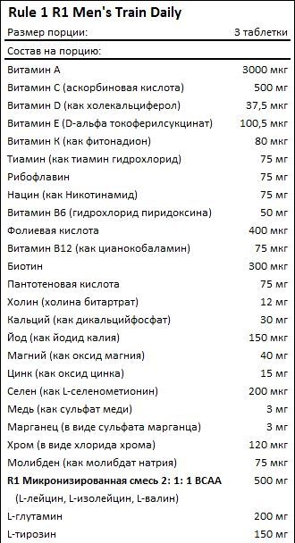 Мощная мультивитаминная формула R1 Train Daily от Rule1 характеризуется наличием широкого спектра питательных веществ в составе: 22 витамина и минерала, пищеварительные ферменты, аминокислоты, растительные экстракты, комплекс каратиноидов, а также богатый фитосоединениями фруктовый концентрат.