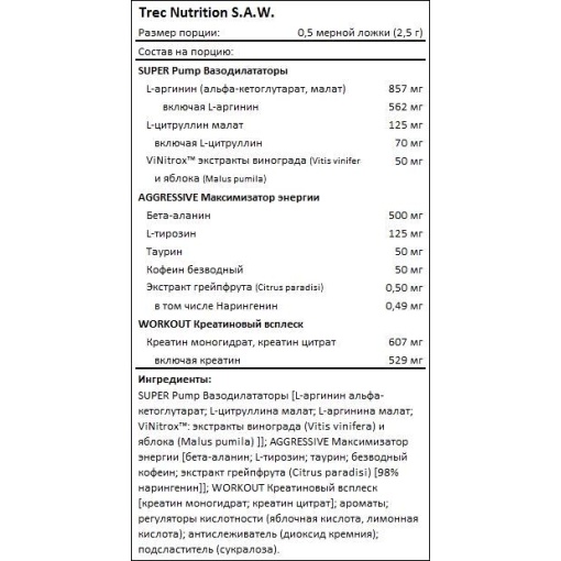 S.A.W. — это формула, сочетающая исключительно проверенные, безопасные и эффективные активные вещества, которые помогут вам преодолеть тренировочный застой уже после первого приема. Этот продукт без лишних добавок, наполнителей и сахара. Благодаря необыкновенно высокому уровню концентрации (почти 96% рецептуры препарата составляют активные вещества) и самому качественному сырью, каждая доза препарата скрывает в себе огромный анаболический и эргогенический потенциал. Компоненты продукта, обладающие синергетическим действием, резко увеличивают возможности организма для работы с большими нагрузками.