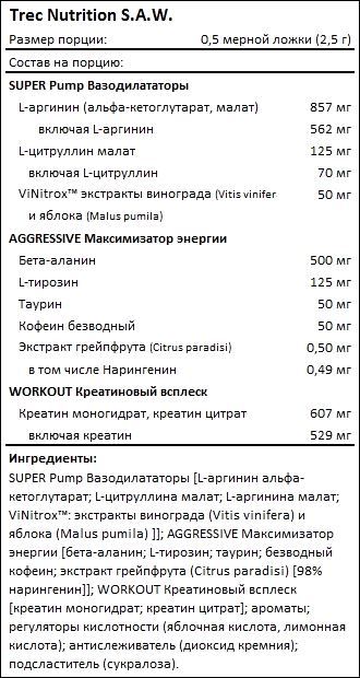 S.A.W. (SAW) — суперконцентрированная предтренировочная формула, предназначенная для профессионалов. Препарат обладает сильным анаболическим действием и стимулирует ускоренный рост работающих мышц. S.A.W. обеспечивает им дополнительное снабжение кислородом и питание.