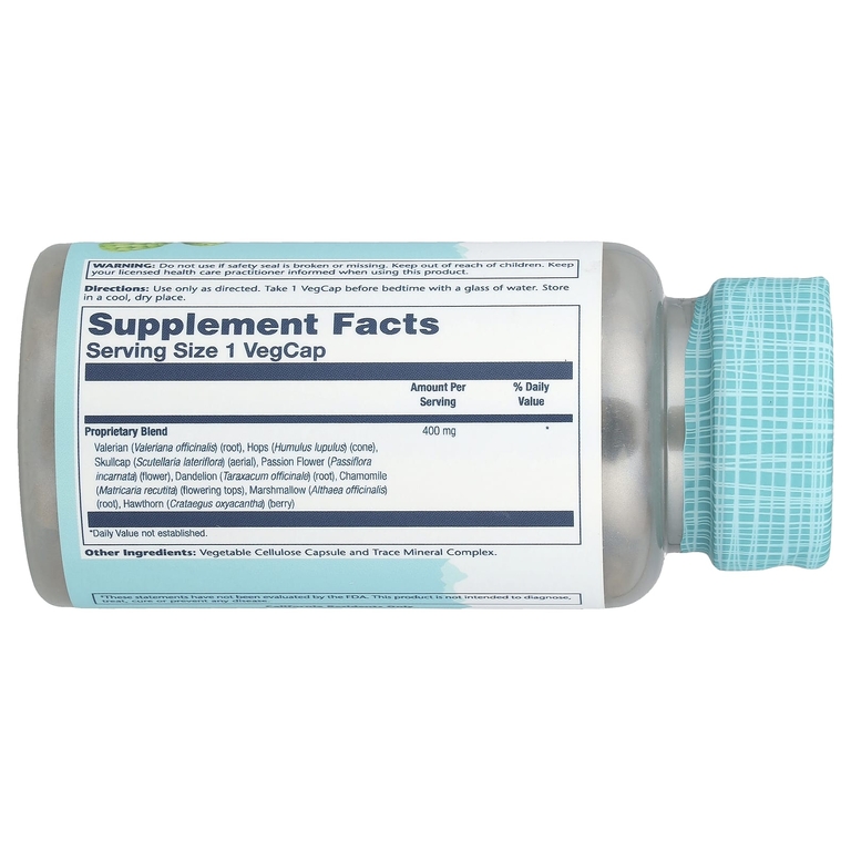 Valerian (valeriana officinalis) (корень), Hops (Humulus lupulus) (конус), Skullcap (Scutellaria lateriflora) (воздушный), Цветок страсти (Passiflora incarnata) (цветок), Одуванчик (Taraxacum officinale) (корень), Ромашка (Matricaria recutita ) (цветущие вершины), Зефир (Althaea officinalis) (корень), Боярышник (Crataegus oxyacantha) (ягода) 400 мг