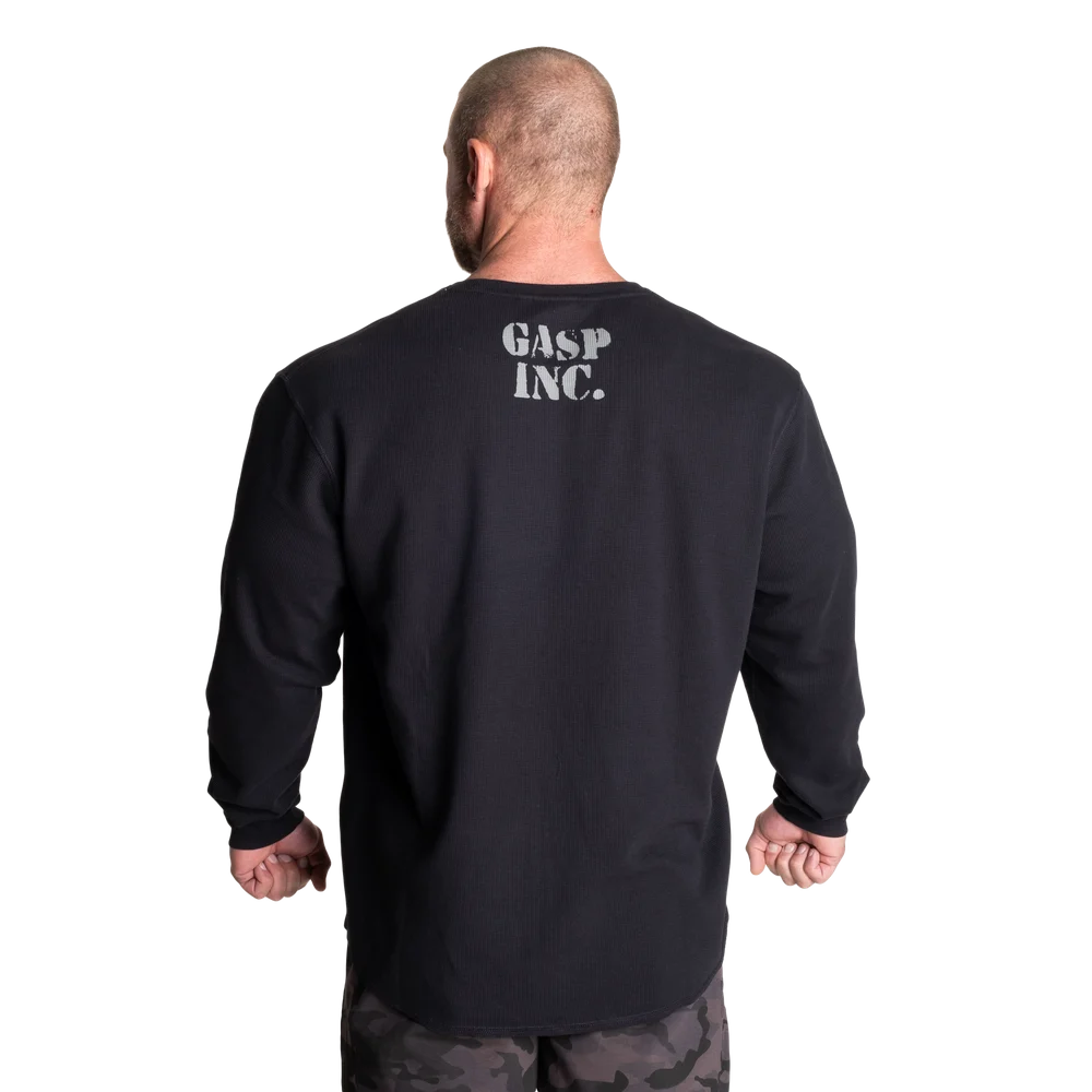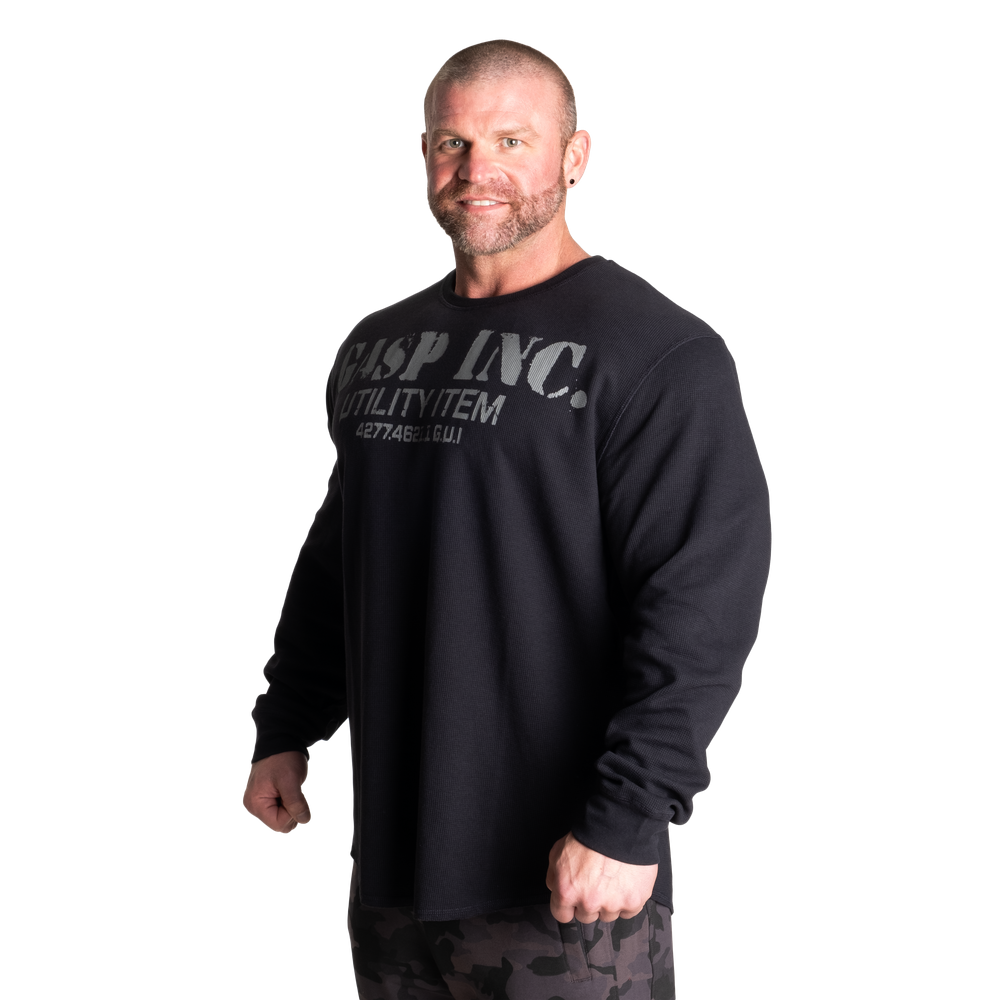 Свитер GASP Thermal Gym Sweater, Asphalt. После многочисленных просьб популярных бодибилдеров был разработан теплый и вместе с тем очень легкий свитер из структурированной дышащей ткани. Эргономичная конструкция данной модели позволяет выполнять сложные упражнения. Термальный эффект ткани сохраняет тепло в мышцах во время интенсивных тренировок.